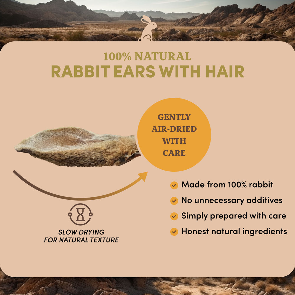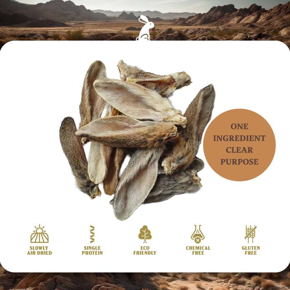 Rabbit Ears with Hair Dog Treats  are a 100% natural, single-ingredient chew designed to support digestive health and provide a species-appropriate treat for dogs. Sourced from premium rabbit, each ear retains its natural hair, offering a gentle source of fiber that helps promote healthy digestion.